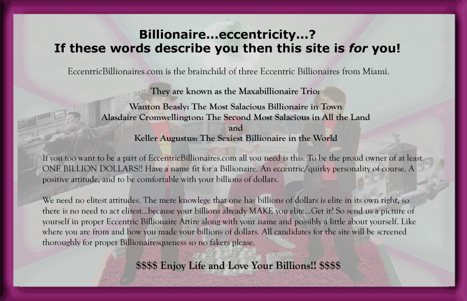 The Maxibillionaire Trio The Original Trio of Eccentric Billionaires that started it all. Hailing from Miami FL the trio is known for having very flamboyant style and yet exceptional taste in women. They called Miami home for quite some time, yes, but have sadly gone their separate ways. A full reunion is yet to be seen, although they vow to some day purchase a small island in the middle of no where to hold radical parties of epic proportion.